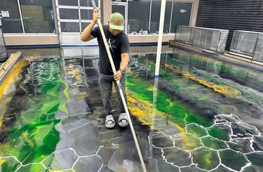 Son pisos decorativos creados con efectos tridimensionales (3D) mediante la aplicación de una imagen o diseño en alta definición sobre el sustrato, que luego es recubierto con capas de resina epóxica transparente para crear una profundidad visual realista. El resultado es un piso que parece tener una imagen viva o una escena que se puede observar desde distintos ángulos con efecto de volumen o relieve.