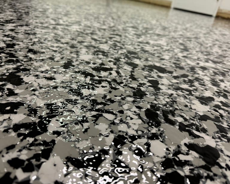 Los pisos con acabado flake combinan diseño decorativo y alta funcionalidad. Están compuestos por hojuelas de vinilo, acrílico o poliéster que se esparcen sobre una base de resina epóxica o poliuretano, creando un acabado atractivo, duradero y antideslizante.